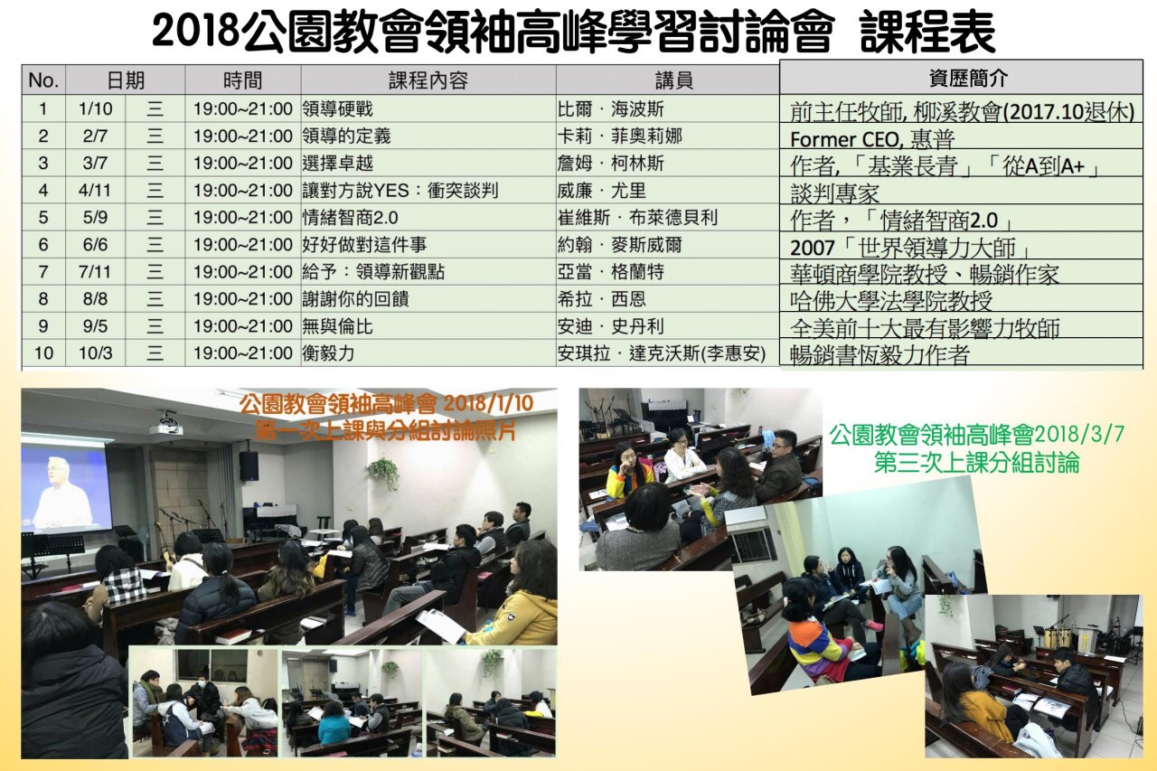 每年參加「全球領袖高峰會台灣區」場次之後,都深感這樣的領袖高峰會值得更多的人來參加,因為「領袖成長,眾人皆贏」,每個人都是一個領導者,至少你領導你自己,有鑑於無論在教會、職場、家庭…等身邊的環境裡參加全球領袖高峰會的人還是少數,為了增加影響力以及領導力,我們決定舉辦為期一年左右的小型領袖高峰會來幫助大家在「領導力」這個關鍵能力上能夠有機會自我學習且成長,可以在工作、家庭、教會、其他身邊的場域都能游刃有餘,發揮領導力,歡迎報名參加!地點;公園教會7樓。