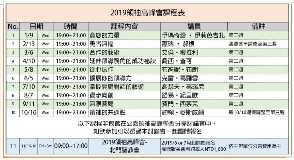 每年參加「全球領袖高峰會台灣區」場次之後,都深感這樣的領袖高峰會值得更多的人來參加,因為「領袖成長,眾人皆贏」,每個人都是一個領導者,至少你領導你自己,有鑑於無論在教會、職場、家庭…等身邊的環境裡參加全球領袖高峰會的人還是少數,為了增加影響力以及領導力,我們決定舉辦為期一年左右的小型領袖高峰會來幫助大家在「領導力」這個關鍵能力上能夠有機會自我學習且成長,可以在工作、家庭、教會、其他身邊的場域都能游刃有餘,發揮領導力,歡迎報名參加!