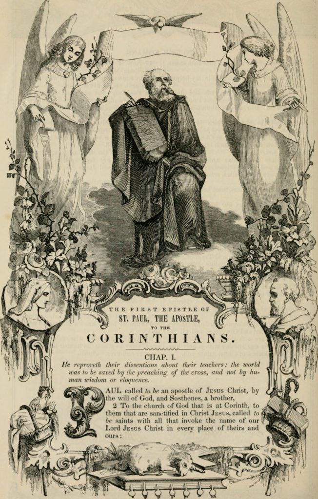 The First Epistle of St. Paul, The Apostle, to the Corinthians. The New Testament of our Lord and Saviour Jesus Christ. Translated from the Latin Vulgate- and diligently compared with the original Greek (1850)University of California Libraries(Public Domain, Wikimedia Commons)