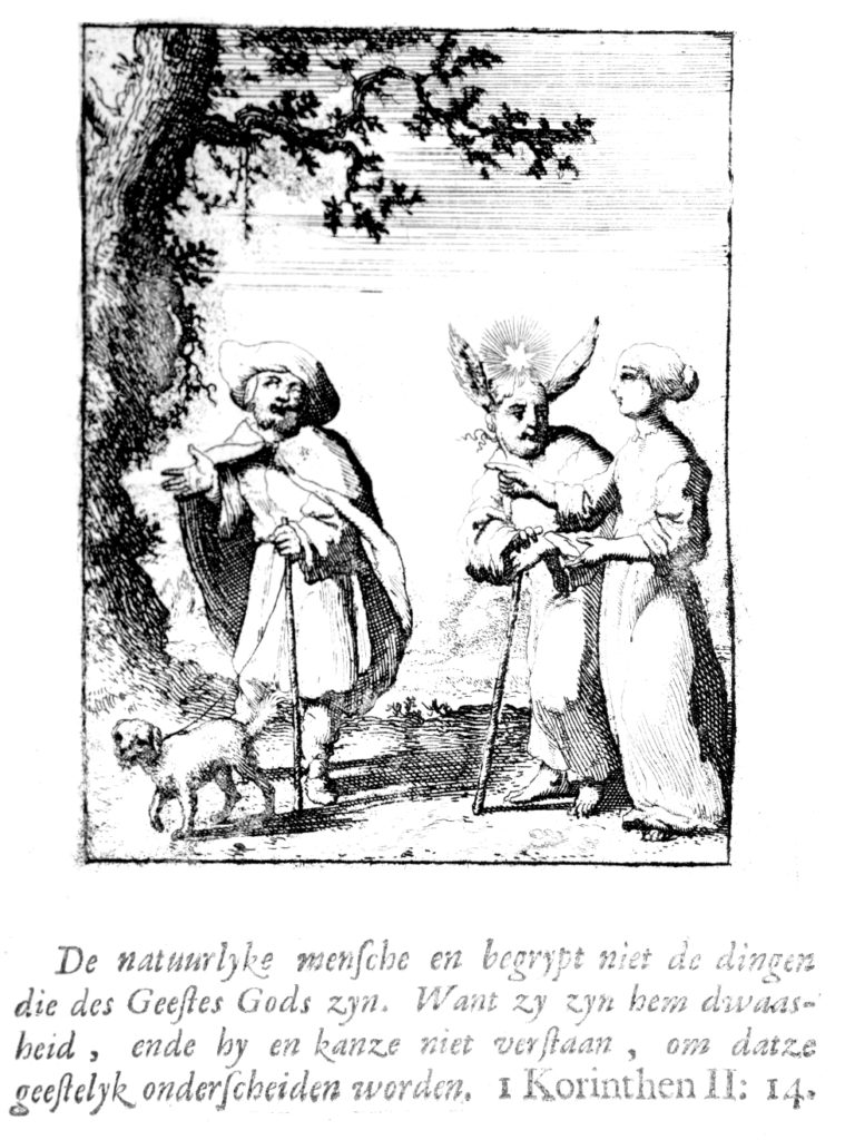 Luiken, Jan – About Paradise, where it is, and how one can contemplate it: The Soul and the Flesh encounter a blind man walking his dog.(before 1712)Jezus en de ziel : Een geestelyke spiegel voor ‘t gemoed : Bestaaende in veertig aangenaame en stichtelyke zinnebeelden : Nevens Het Eeuwige Vaderland en deszelfs vreugde(Public Domain, Pitts Theology Library, Candler School of Theology, Emory University)