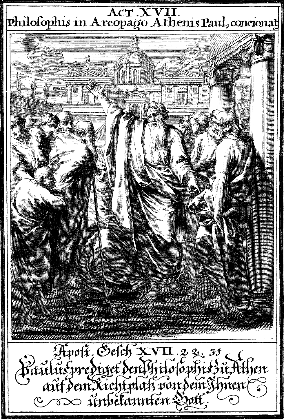Weigel, Christoph – Paul in Athens(before 1725)Biblia ectypa : Bildnussen auss Heiliger Schrifft Alt und Neuen Testaments in welchen alle Geschichte und Erscheinungen deutlich und schrifftmässig zu Gottes Ehre und andächtiger Seelen erbaulicher Beschauung vorgestellet werden.(Public Domain, Pitts Theology Library, Candler School of Theology, Emory University)