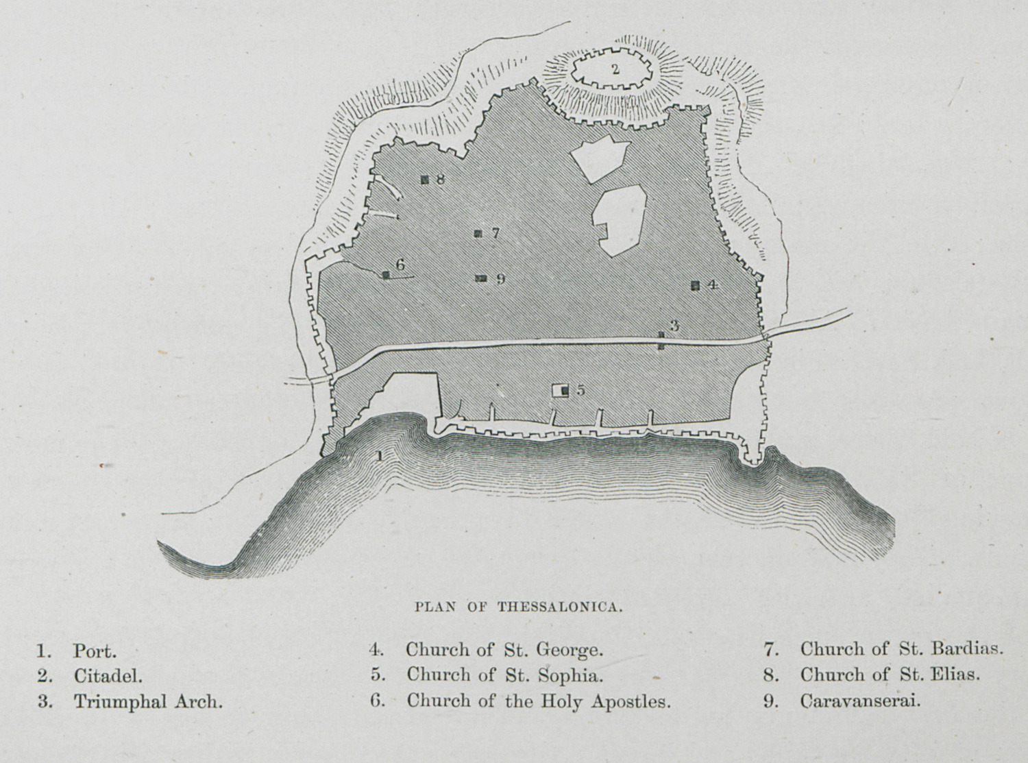 Félix Marie Charles Texier – Plan of Thessalonica 帖撒羅尼迦. Byzantine Arcitecture, illustrated by Examples of Edifices erected in the East during the earliest Ages of Christianity, R.Popplewell Pullan, London, Day & Son, 1864.(Public Domain, Wikimedia Commons)