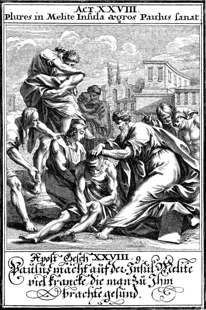 Weigel, Christoph – Paul Heals Publius’s Father(before 1725)Biblia ectypa : Bildnussen auss Heiliger Schrifft Alt und Neuen Testaments in welchen alle Geschichte und Erscheinungen deutlich und schrifftmässig zu Gottes Ehre und andächtiger Seelen erbaulicher Beschauung vorgestellet werden.(Public Domain, Pitts Theology Library, Candler School of Theology, Emory University)