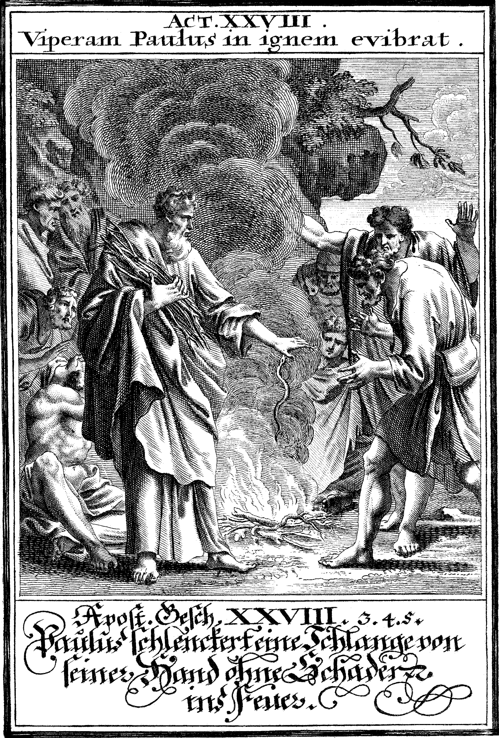 Weigel, Christoph – Paul and Viper(before 1725)Biblia ectypa : Bildnussen auss Heiliger Schrifft Alt und Neuen Testaments in welchen alle Geschichte und Erscheinungen deutlich und schrifftmässig zu Gottes Ehre und andächtiger Seelen erbaulicher Beschauung vorgestellet werden.(Public Domain, Pitts Theology Library, Candler School of Theology, Emory University)