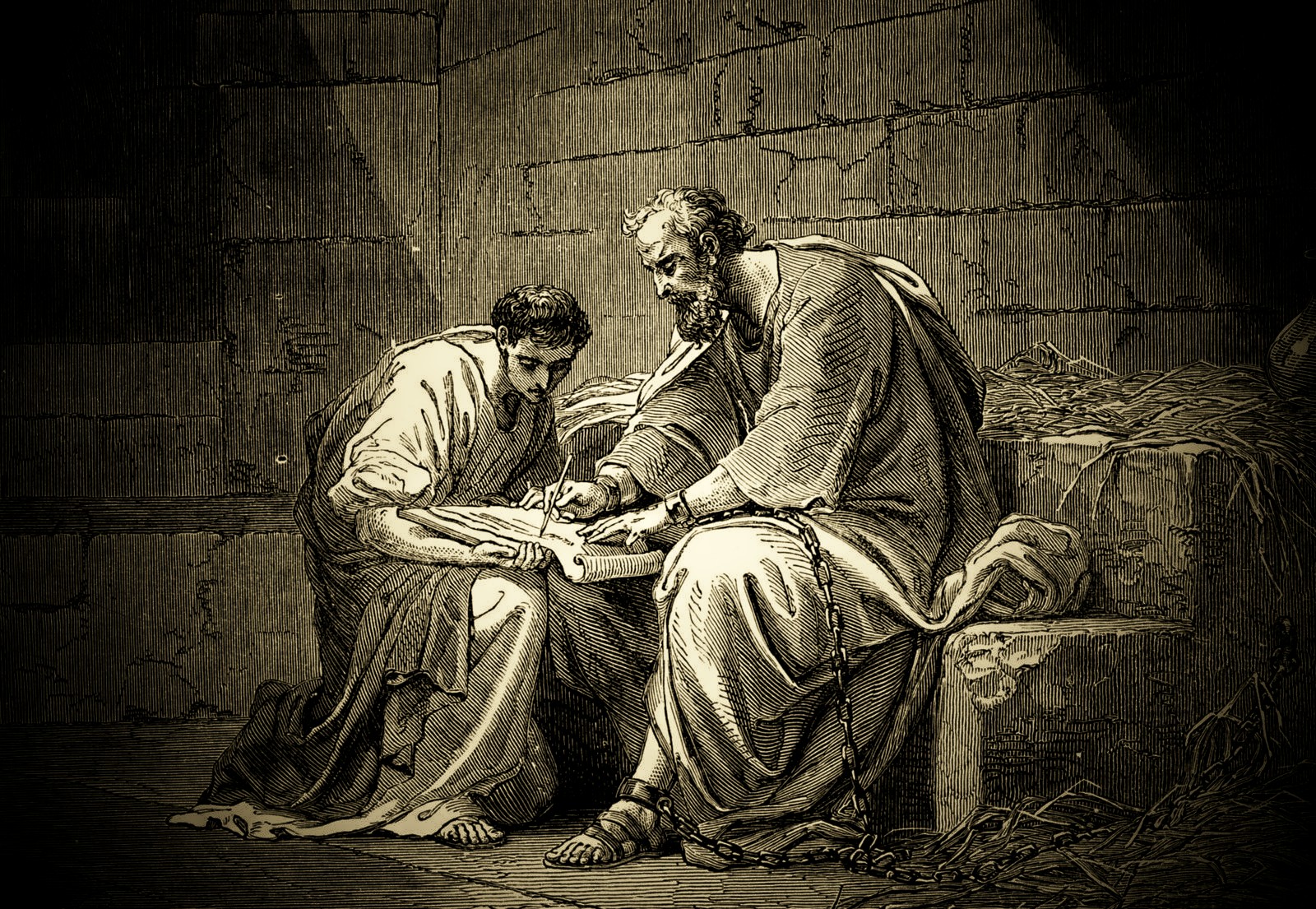 Gustave Doré – St. Paul, imprisoned, ends the letter to the Ephesians, and hands it over to Tychicus (Ephesians 6, 21-23). Wood engraving.(1886)(Public Domain, Wikimedia Commons)