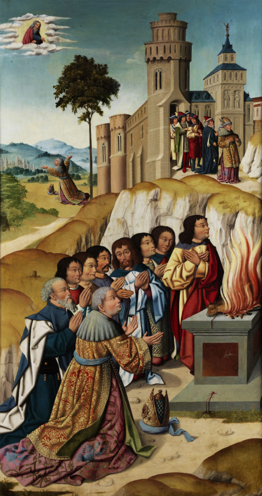 Andalusische Schule – Samuels Brandopfer und Prozession aus Jerusalem (1. Buch Samuel 7ff.) oder Schuldbekenntnis Davids (2. Buch Samuel Kap. 17-24) oder auch Opfer Salomos nach der Errichtung des Tempels (1. Samuel, Kap. 8).(1500~1520)(Public Domain, Wikimedia Commons)