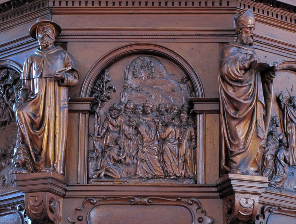 Alsace, Bas-Rhin, Église Saint-Georges de Molsheim, ancienne église des Jésuites (1618) (PA00084798, IA67006097). Chaire à prêcher (1631): Statues de Pères de l’église (St-Jérôme, St-Augustin), Relief “Jésus guérit un lépreux”.(Creative Commons Attribution-Share Alike 4.0 International license., © Ralph Hammann – Wikimedia Commons Wikimedia Commons)