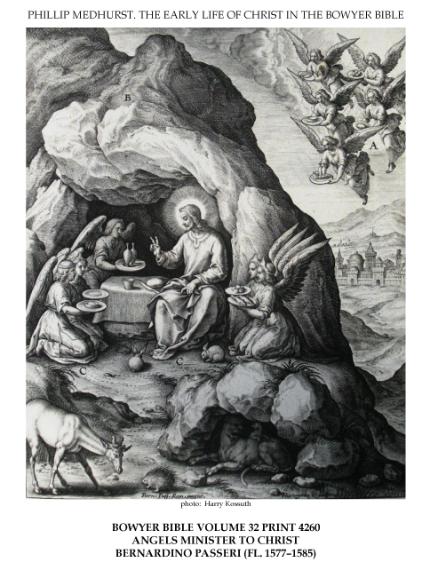Hieronymus Wierix after Bernardino Passeri – Bowyer Bible Volume 32 Print 4260 Angels minister to Jesus in the wilderness(1563)(Free Art License, photo by Phillip Medhurst Wikimedia Commons)