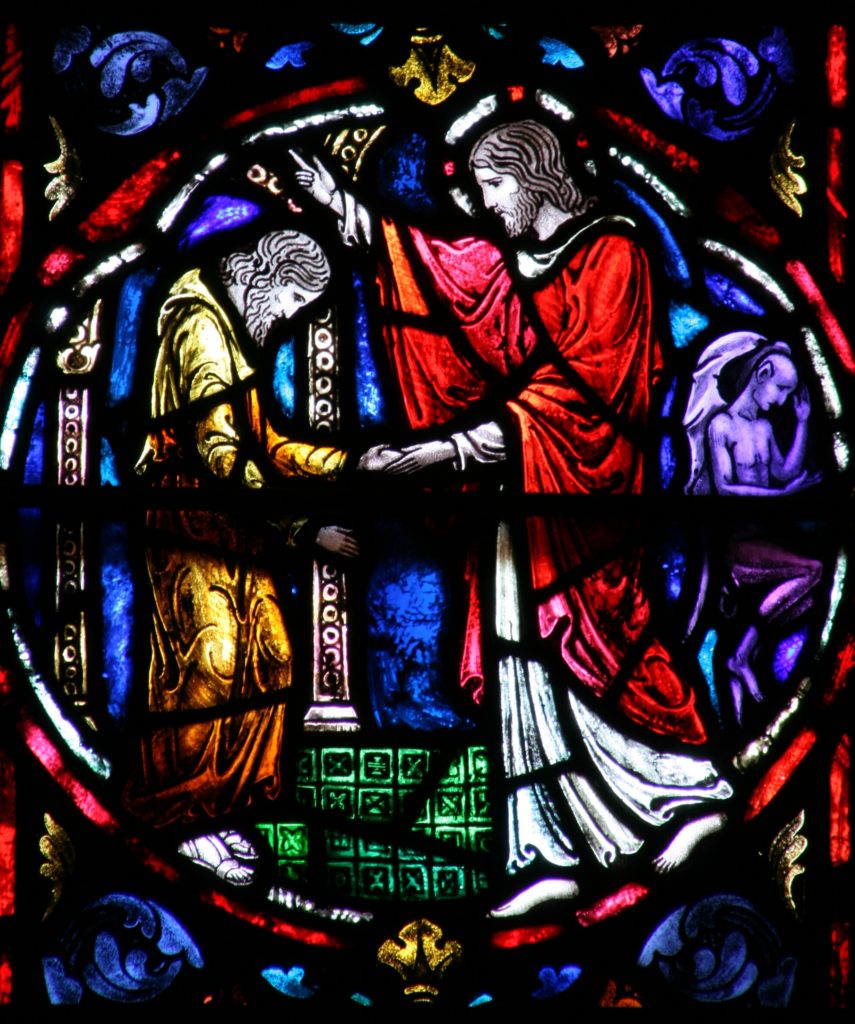 Window on the left of the sanctuary of St Anne’s, Aigburth, Liverpool, depicting Jesus healing the leper.(Creative Commons Attribution-Share Alike 4.0 International license. by Rodhullandemu, Wikimedia Commons)