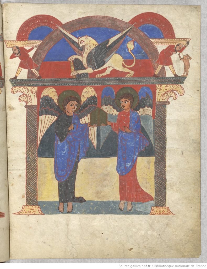 Stephanus Garsia (and other unnamed) – Anges tenant l’évangil. The Saint-Sever Beatus, also known as the Apocalypse of Saint-Sever, (Paris, Bibliothèque Nationale, MS lat. 8878) is a French Romanesque illuminated Apocalypse manuscript from the 11th Century.(Public Domain, Wikimedia Commons)