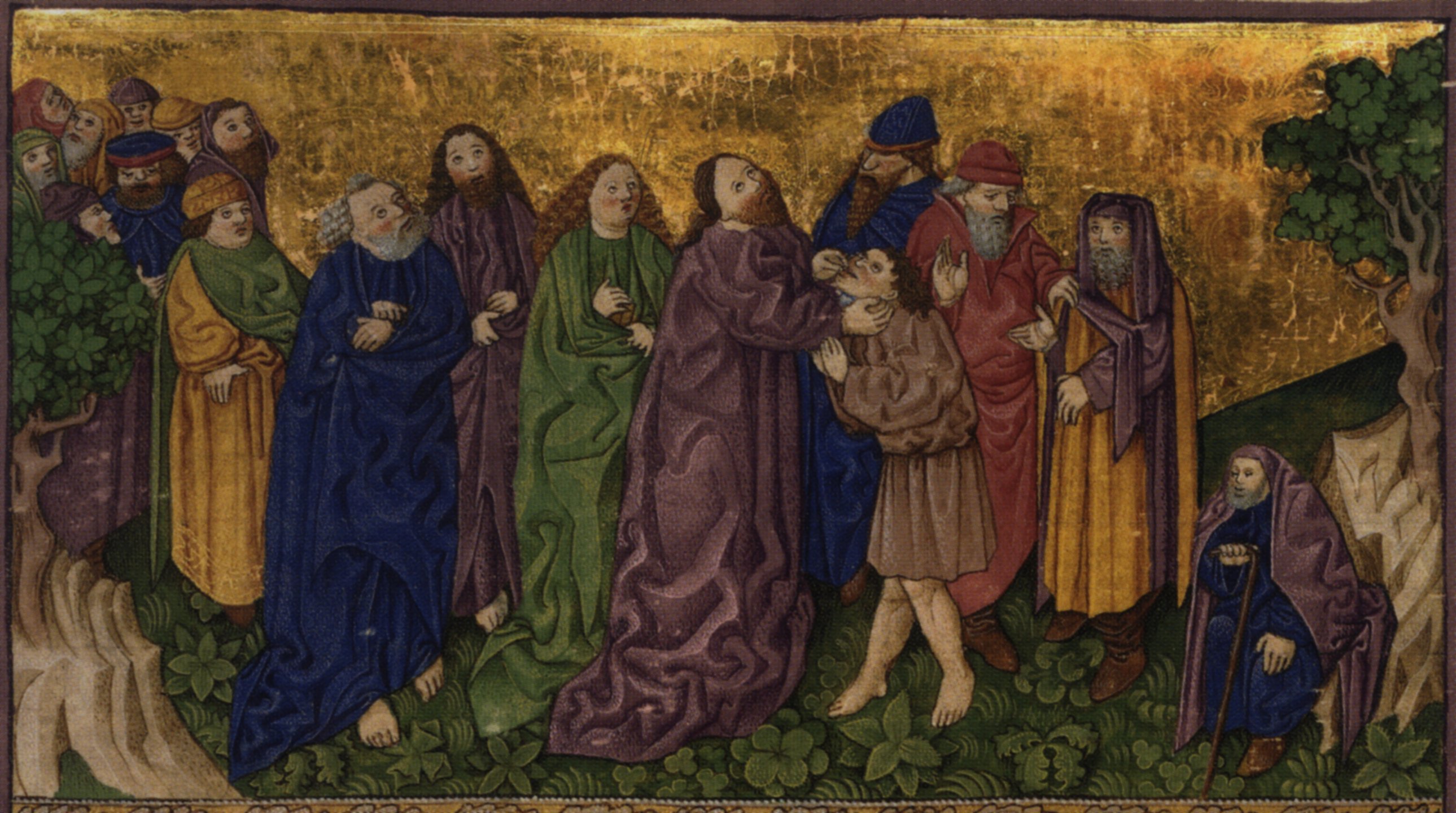 Unknown, (Markusmaler und Gehilfe) – Page 55v: Healing of a deaf-mute, Mc 7:31-37(1425~30)(Public Domain, Wikimedia Commons)