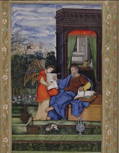 Kesu Das – St. Matthew writing the Gospel with an angel holding the volume., an Islamic miniature(c.1530)(Public Domain, Wikimedia Commons)
