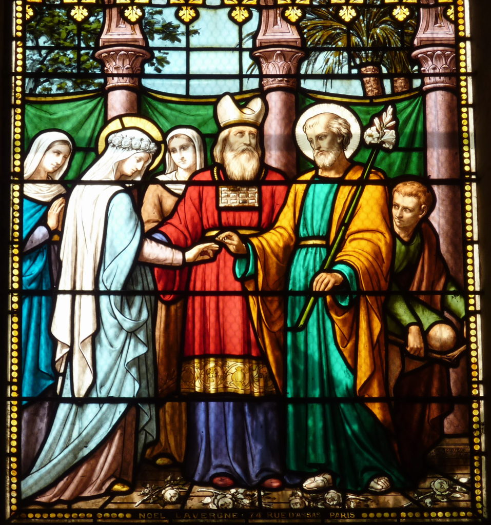 Bleiglasfenster in der Stiftskirche Saint-Quiriace in Provins, einer Gemeinde im Département Seine-et-Marne (Île-de-France), Darstellung: Geschichte des Joseph, untere Szene rechts: Heirat Josephs und Marias( Creative Commons Attribution-Share Alike 3.0 Unported, Wikimedia Commons)