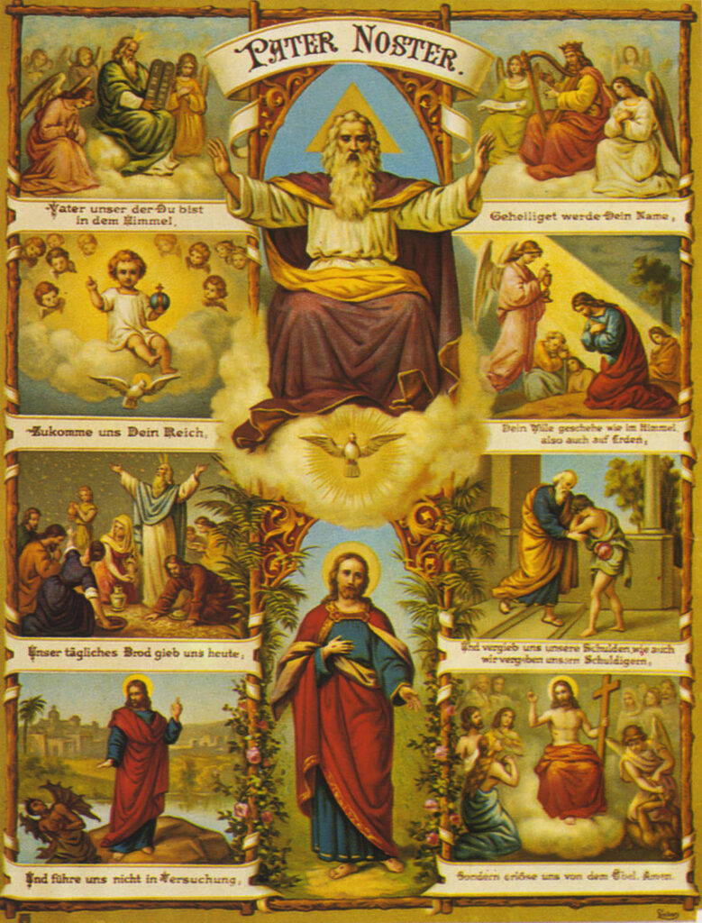 Fridolin Leiber – “Our Father” prayer with Trinity in central column (God the Father, dove of the Holy Spirit, Jesus) and Biblical and symbolic scenes in left and right columns.(before 1900)Wolfgang Brückner: Elfenreigen – Hochzeitstraum. Die Öldruckfabrikation 1880–1940. M. DuMont Schauberg, Köln 1974, ISBN 3-7701-0762-4(Public Domain, Wikimedia Commons)