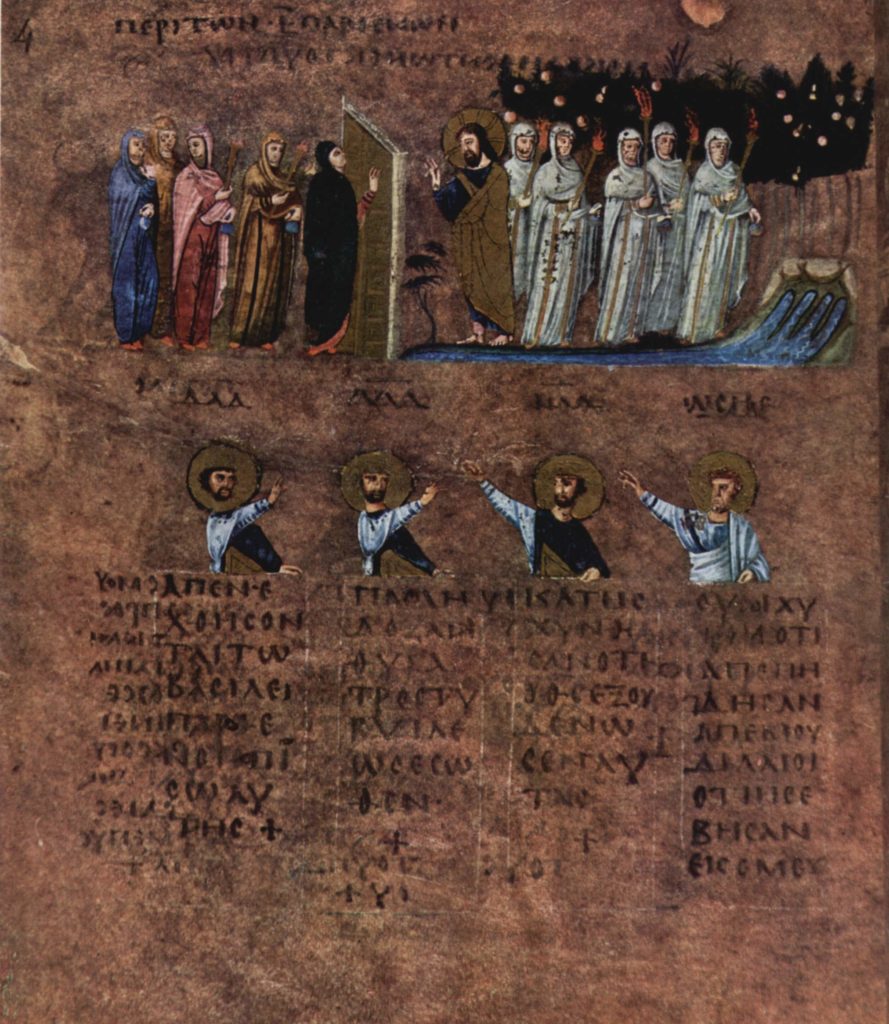 Anonymous – The parable of the wise and the foolish virgins, Rossano Gospels(c.550)(Public Domain, Wikimedia Commons)