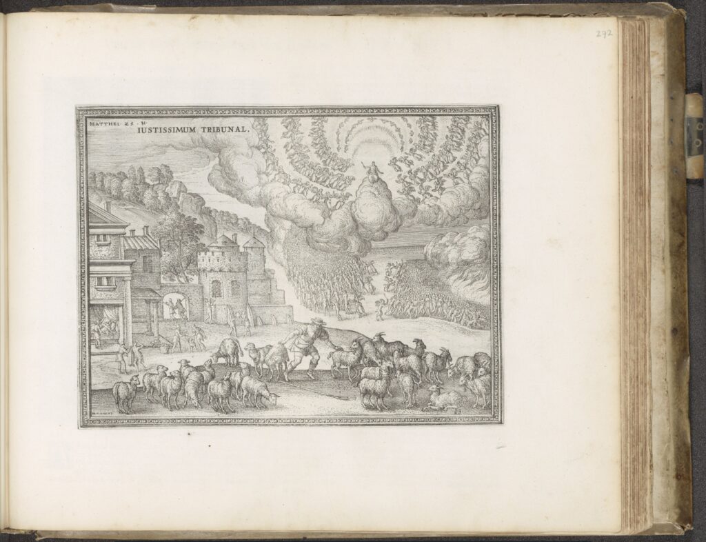 The parable of the sheep and goats; a flock of sheep moving towards Christ and the Holy Spirit in right background; in left foreground a goat jumping towards a soldier and a rich man in conversation; illustration to an unidentified New Testament. (c.1551)British Museum(Public Domain, Wikimedia Commons)