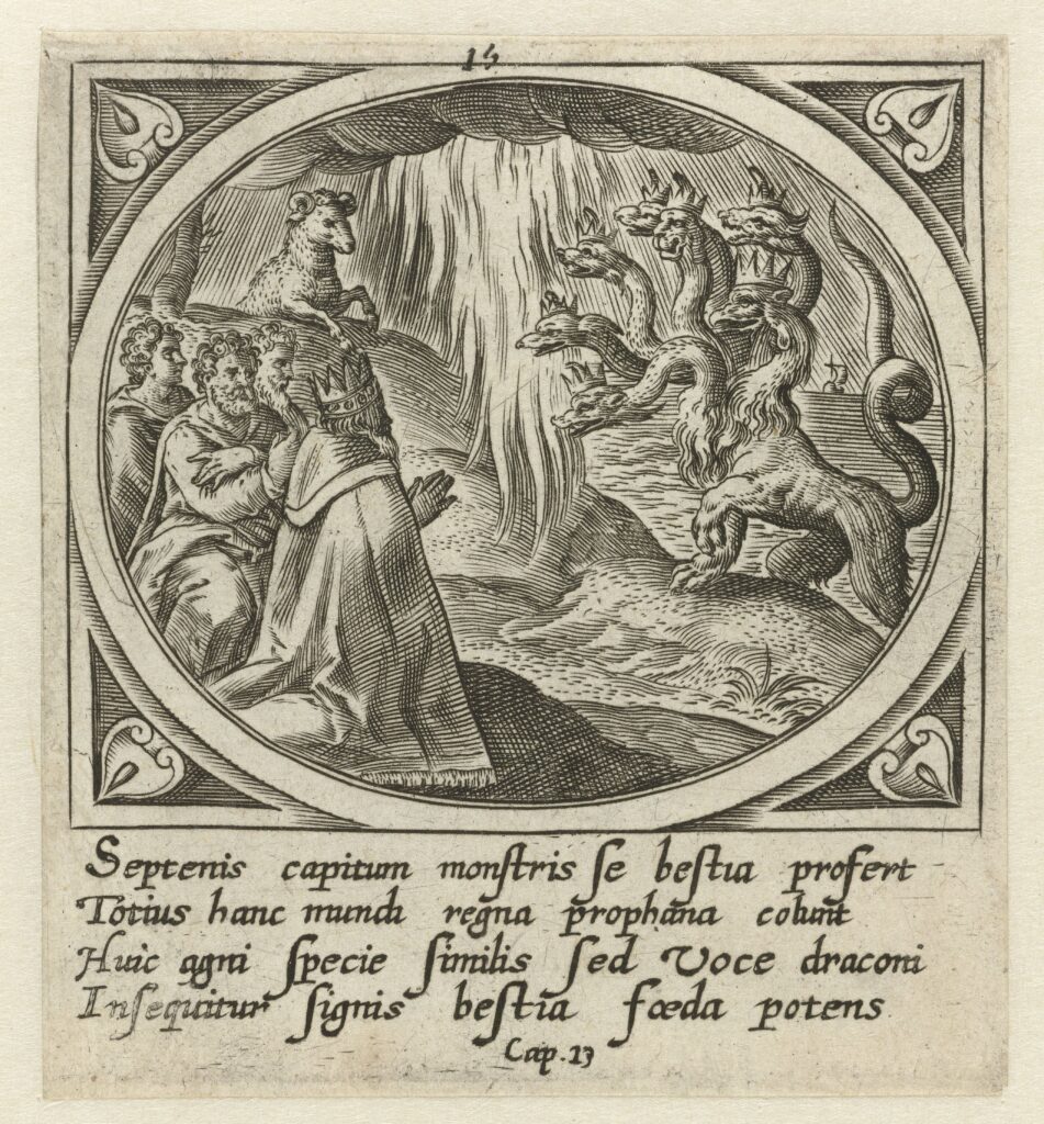 Adriaen Collaert – Aanbidding van het zevenkoppige beestOpenbaring van Johannes op Patmos (serietitel)Icones Revelationum S Johs Evangeliste in Pathmo (serietitel)(1585)(Creative Commons CC0 1.0 Universal Public Domain Dedication, Wikimedia Commons)