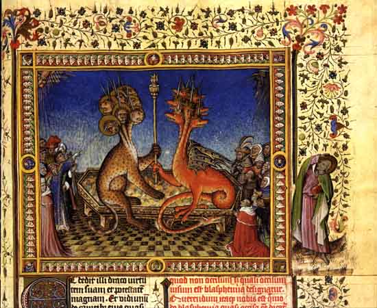 The Elizabeth Day McCormick Apocalypse. fol. 107rBeast and Dragon, Worship. First Beast, with seven heads, ten horns, and crowns, emerges from sea, at center; crowned Dragon, background left; worshipers kneel, lower right.(17th century)(Public Domain, Wikimedia Commons)