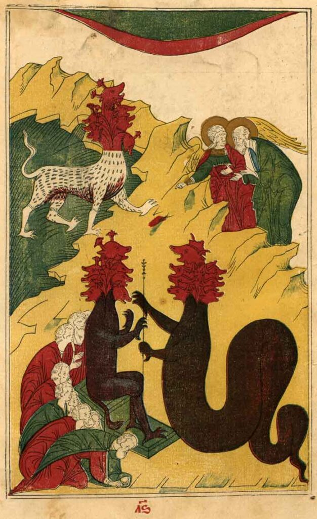 Anonymous Russian Old Believer – Walters Ms. W917 – Apocalypse by Andrew of Caesarea f.121v The dragon and the beast(c.1800)(Public Domain, Wikimedia Commons)