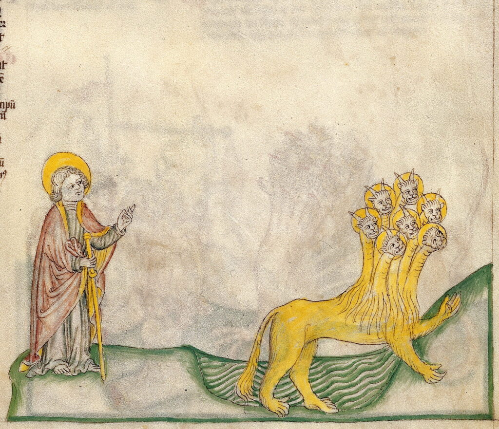 (“Seven-headed beast trampling on a saint”). Laurent d’Orleans, La somme le roi, with Gospels and the Complainte de Notre Dame. Paris, 2nd quarter of the 14th century(Public Domain, Wikimedia Commons)