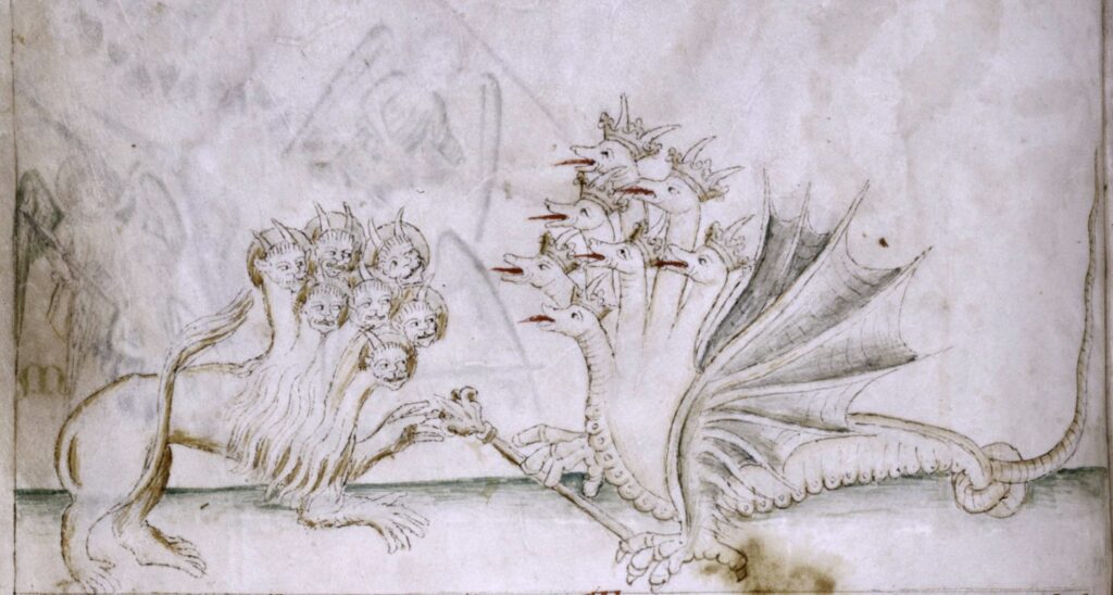 Anonymous – Queen Mary Apocalypse – BL Royal MS 19 B XV f. 23 Beast and dragon(1st quarter of the 14th century)(Public Domain, Wikimedia Commons)