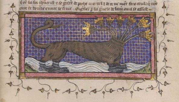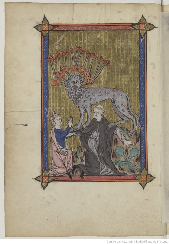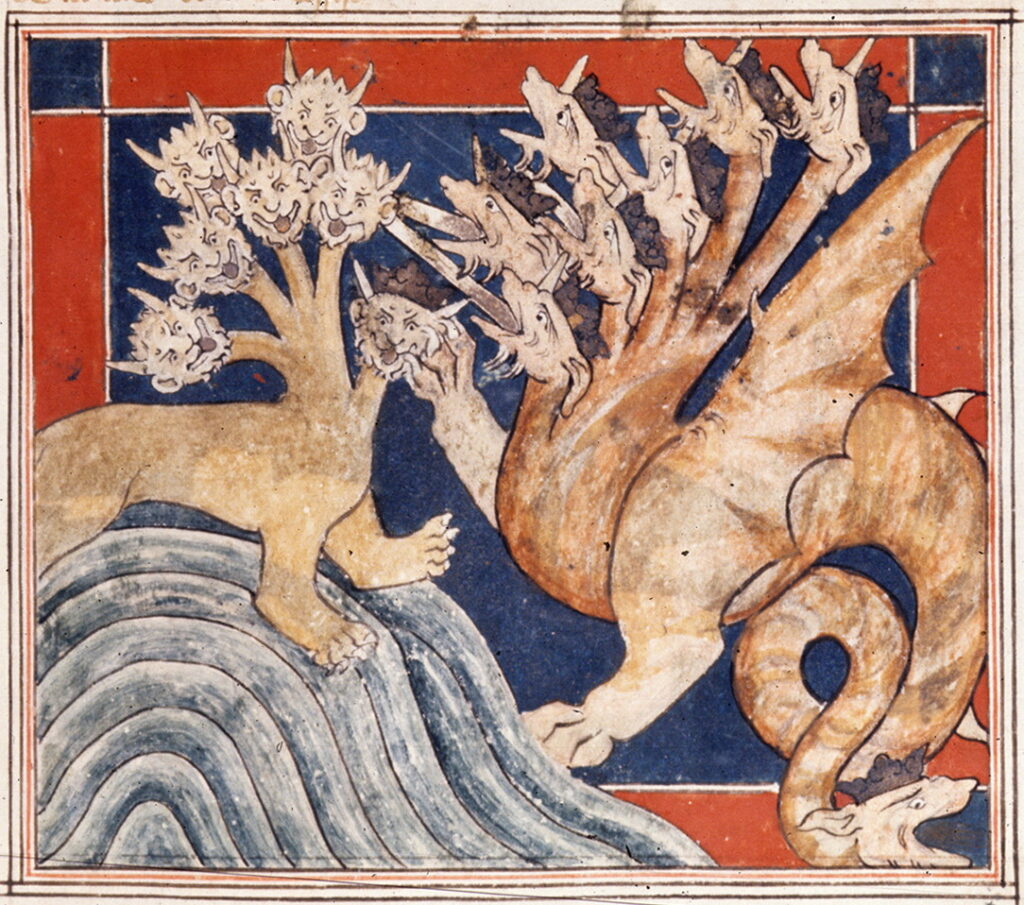 Anonymous – The Seven-headed Beast of the Apocalypse Venerated by a Hypocrite and Crushing a Saint, from ‘La Somme le Roy’ by Frere Laurent,(1311)Bibliothèque de l’Arsenal, Ms-6329 réserve(Public Domain, Wikimedia Commons)