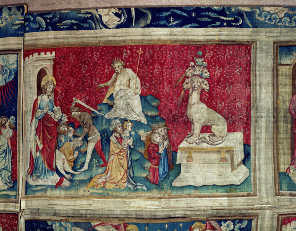 Atelier de Nicolas Bataille sur cartons de Hennequin de Bruges. – Tenture de l’Apocalypse(entre 1373-1377 et 1382)Musée de la Tapisserie de l’Apocalypse, château d’Angers, Angers (France)(Creative Commons Attribution-Share Alike 3.0 Unported, 2.5 Generic, 2.0 Generic and 1.0 Generic license. photo by Remi Jouan, Wikimedia Commons)
