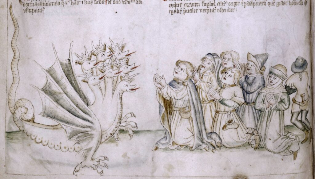 Anonymous – The dragon, standing on the sands, makes war on the rest of the woman’s offspring – St John sees the beast rise from the water.(c.1420~30)Apocalypsis S. Johannis cum glossis et Vita S. Johannis(Creative Commons Attribution 4.0 International license. by Wellcome Images, Wikimedia Commons)