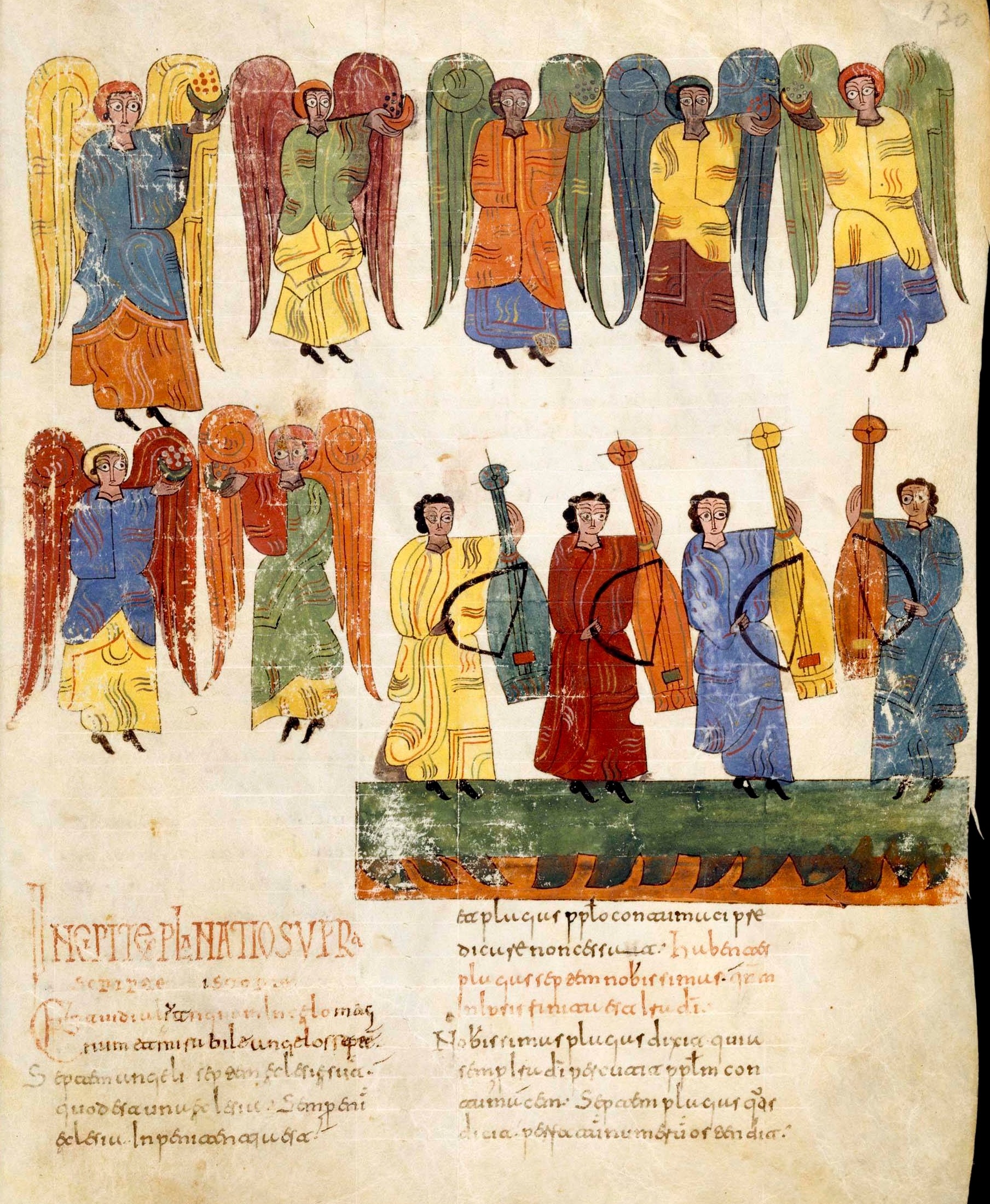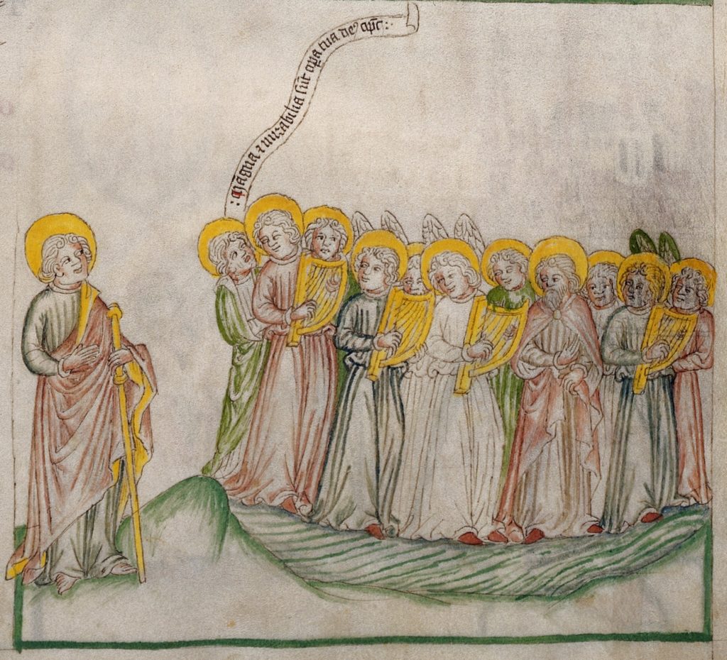 De Ricci – Sixth vision- John sees seven angels with the seven plagues in jars, and seven angels holdings harps, and standing on a sea of glass shot through with fire(1318)(Public Domain, Wikimedia Commons)