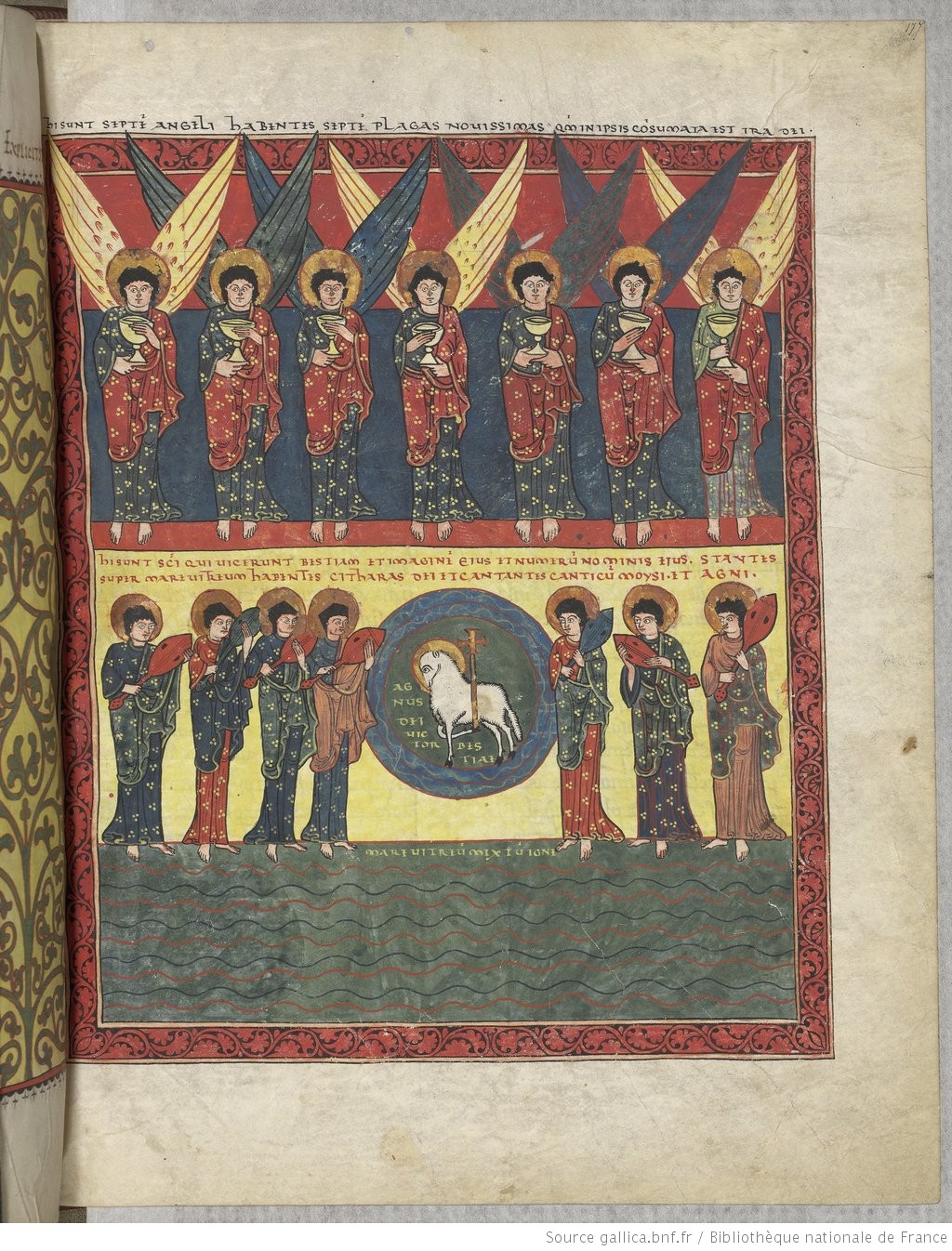 Anonymous: Leaf from a Beatus Manuscript: Seven Angels Hold the Cups of the Seven Last Plagues; The Hymn of the Lamb(c.1180)Metropolitan Museum of Art, New York City(Creative Commons CC0 1.0 Universal Public Domain Dedication, Wikimedia Commons)