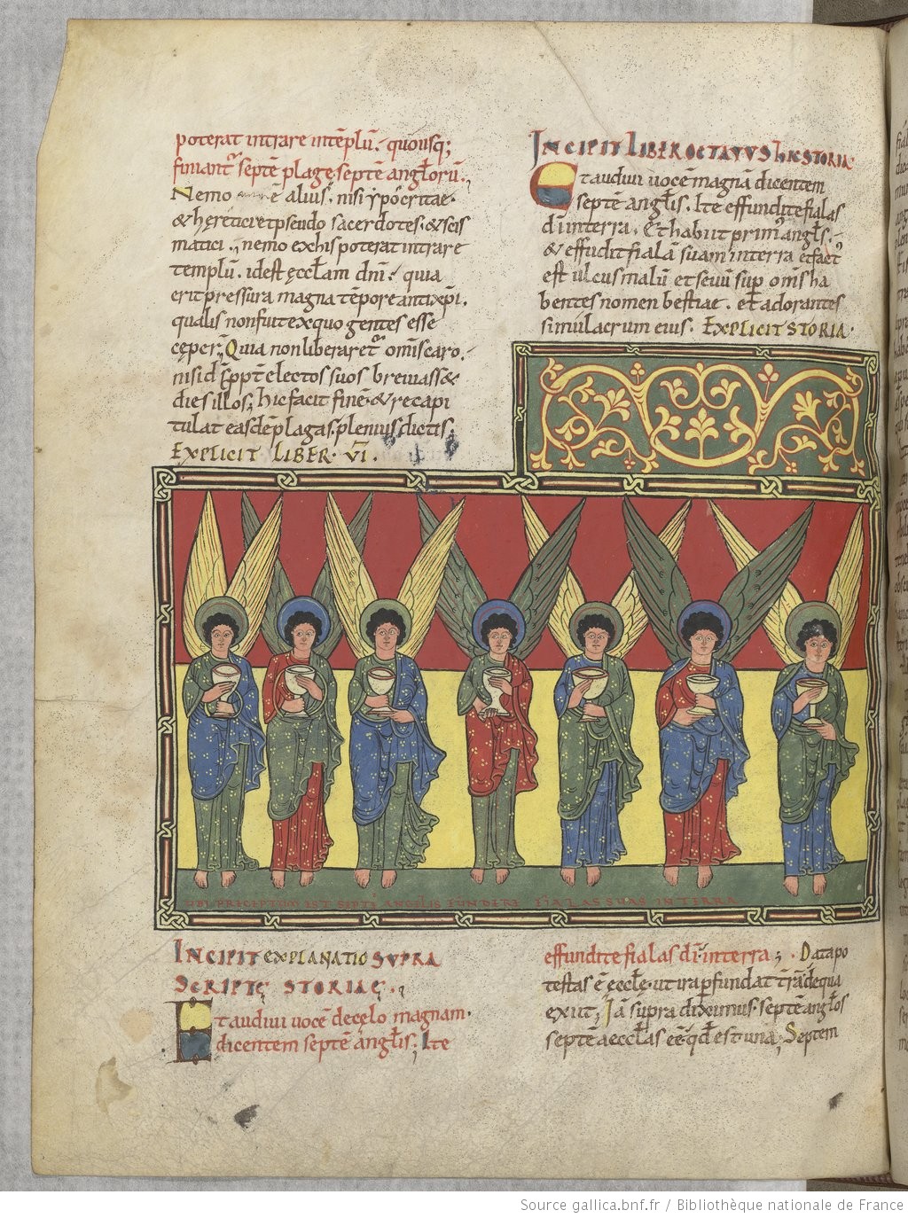 Stephanus Garsia and other hands, St Beatus (original) – Seven Bowls. The Saint-Sever Beatus, also known as the Apocalypse of Saint-Sever, (Paris, Bibliothèque Nationale, MS lat. 8878) is a French Romanesque illuminated Apocalypse manuscript from the 11th Century(Creative Commons Attribution-Share Alike 4.0 International license., Wikimedia Commons)