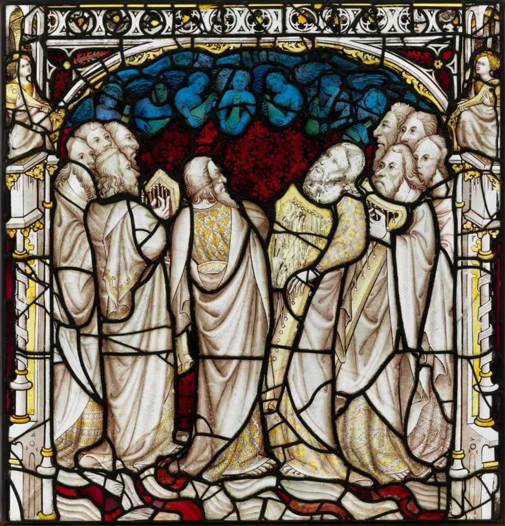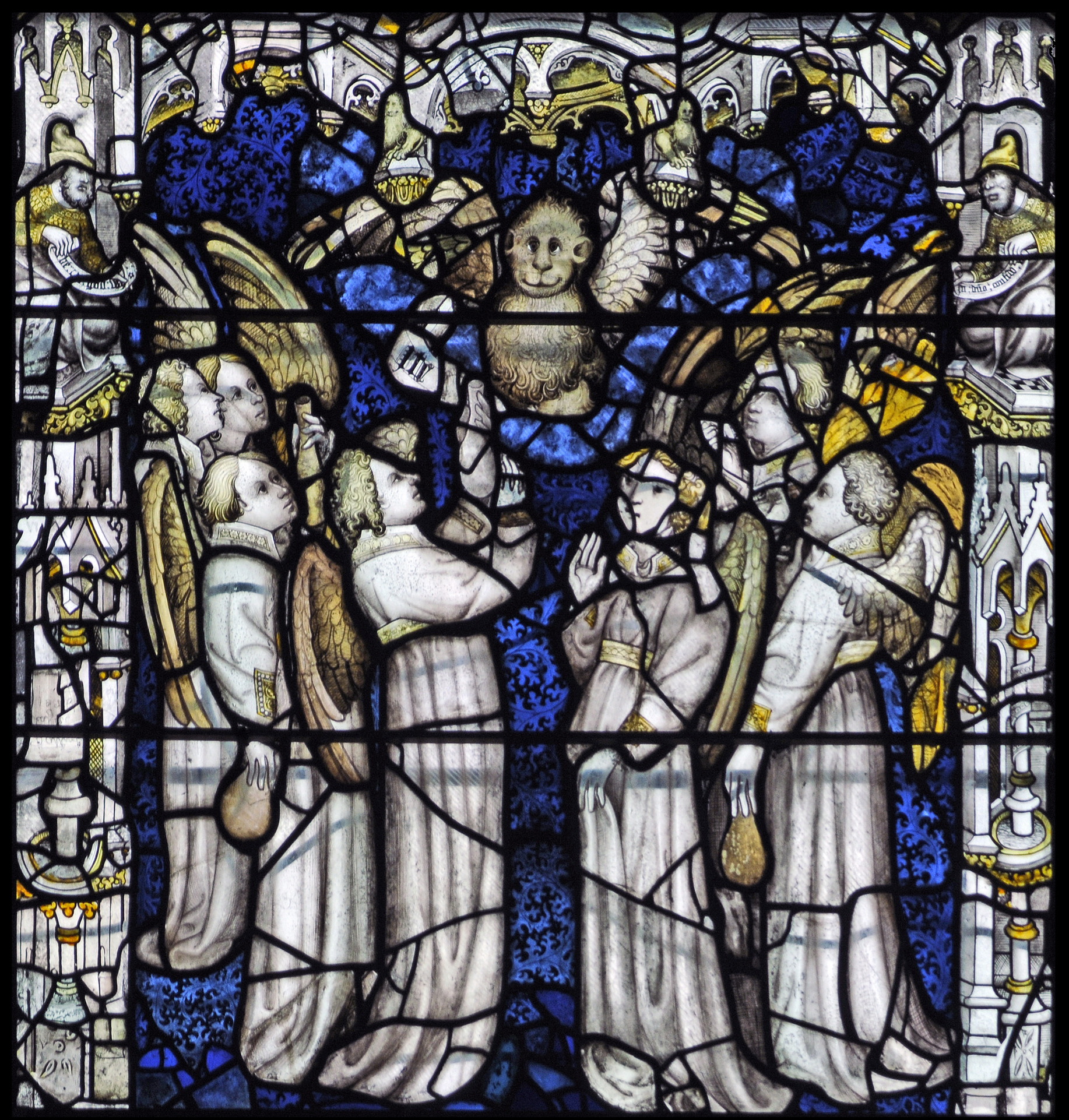 Coventry glazier John Thornton – Plague Angels and the Harpers (Rev 15, 1-2). York Minster, Great East Window(1405~8)(Public Domain, Wikimedia Commons)