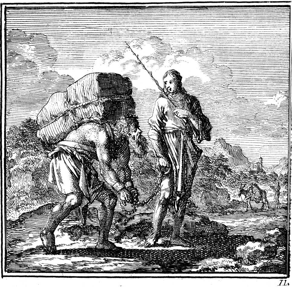 Luiken, Jan – The Lawful Government. An old man [Mankind], bent under the weight of a heavy load, is led with a chain by a young man [the Soul] who carries a whip.(before 1712)De onwaardige wereld : vertoond in vyftig zinnebeelden, met godlyke spreuken en stichtelyke verzen(Public Domain, Pitts Theology Library, Candler School of Theology, Emory University)