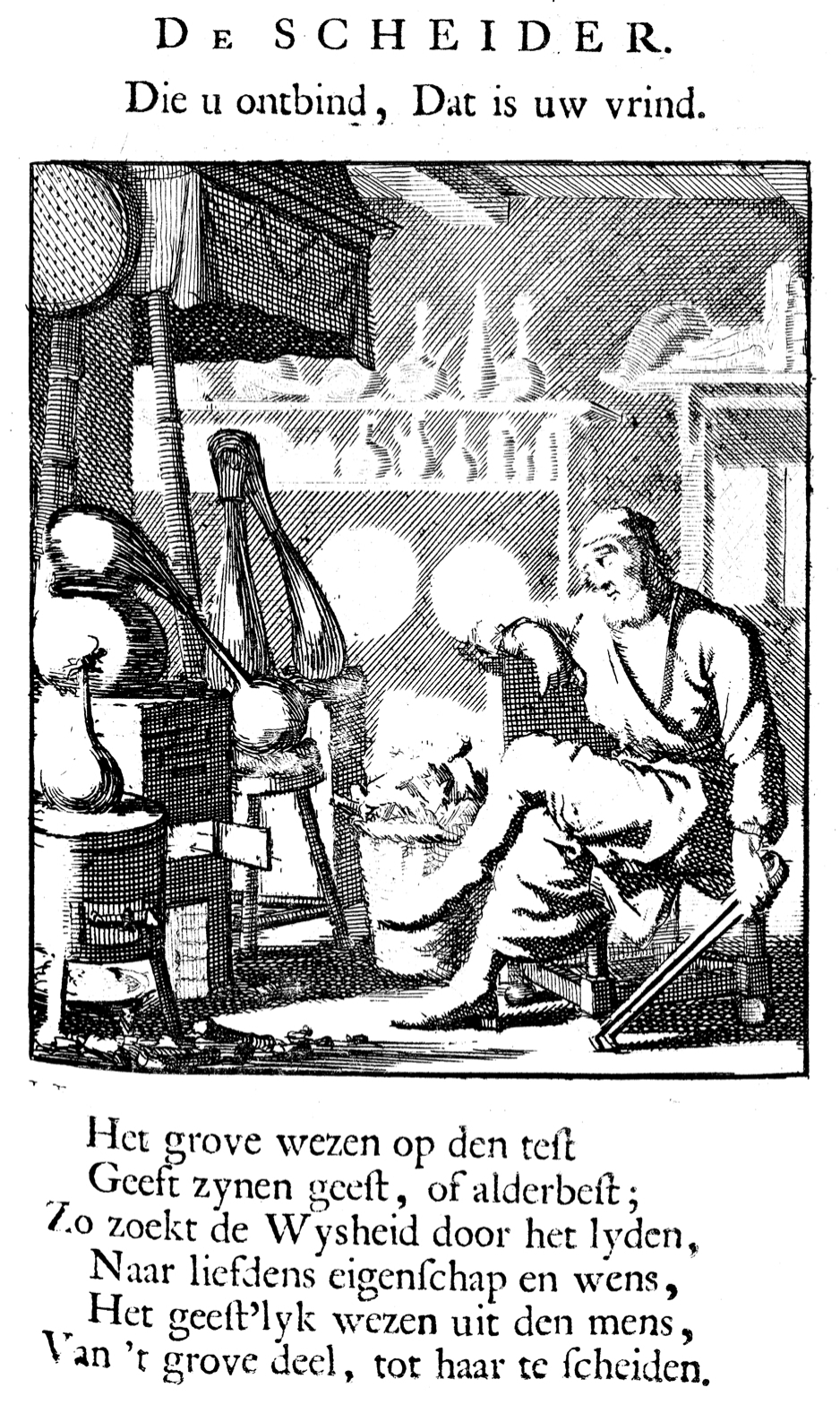 Luiken, Jan – The Chemist: He who releases thee, Is thy friend.(before 1712)Spiegel van het menselyk bedryf : vertoonende honderd verscheiden ambachten, konstig afgebeeld en met godlyke spreuken en stichtelyke verzen verryke(Public Domain, Pitts Theology Library, Candler School of Theology, Emory University)