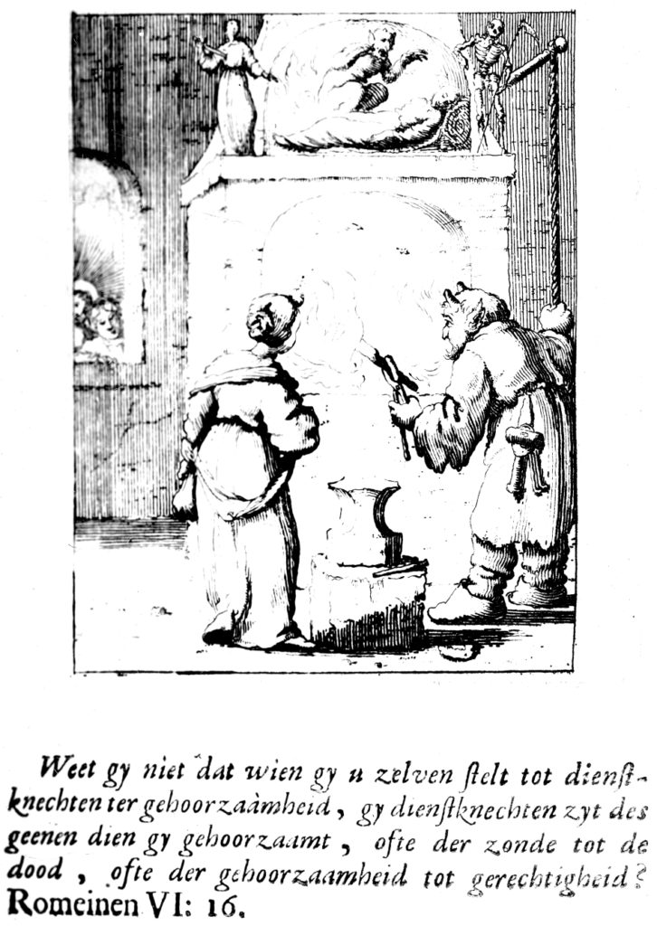Luiken, Jan – How the wicked Soul fares, when her body dies. The Devil, portrayed as a blacksmith, holds a piece of iron in the fire. The Soul, portrayed as a young woman, looks on. Above the forge is an image of the dead Soul in hell, watched over by the Devil.(before 1712)Jezus en de ziel : Een geestelyke spiegel voor ‘t gemoed : Bestaaende in veertig aangenaame en stichtelyke zinnebeelden : Nevens Het Eeuwige Vaderland en deszelfs vreugde(Public Domain, Pitts Theology Library, Candler School of Theology, Emory University)