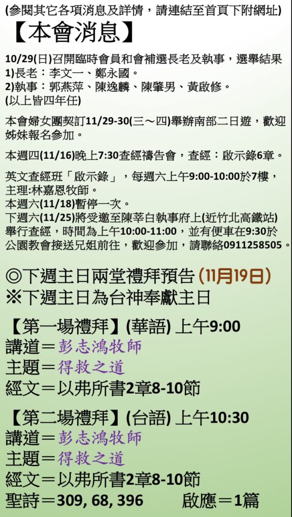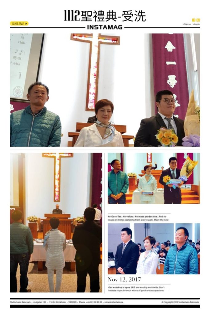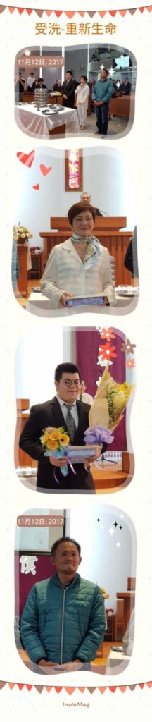 聖禮典 成人洗禮:邱奕博、賴惠敏。 會籍轉入信仰告白:顏恭信。 見證: 4. 顏恭信 。