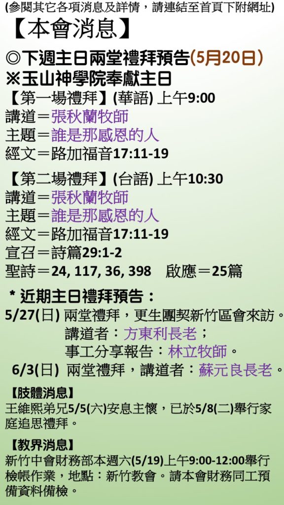 4:4 你們要因為跟主連結而常常喜樂。我再說,你們要喜樂! 4:5 你們也要向大家表現謙讓。主就要來了。 4:6 你們應該一無掛慮;要在禱告中把你們所需要的告訴上帝,用感謝的心祈求。 4:7 上帝所賜那超越人所能理解的平安,會藉基督耶穌,保守你們的心懷意念。