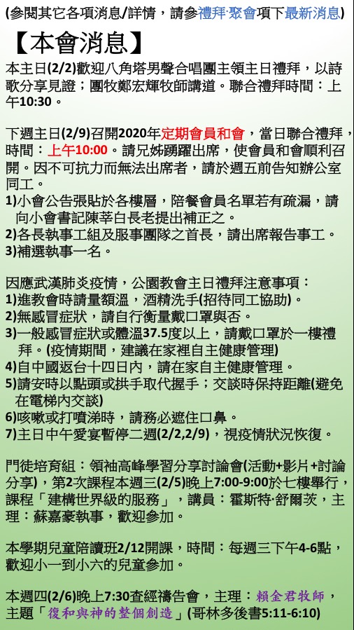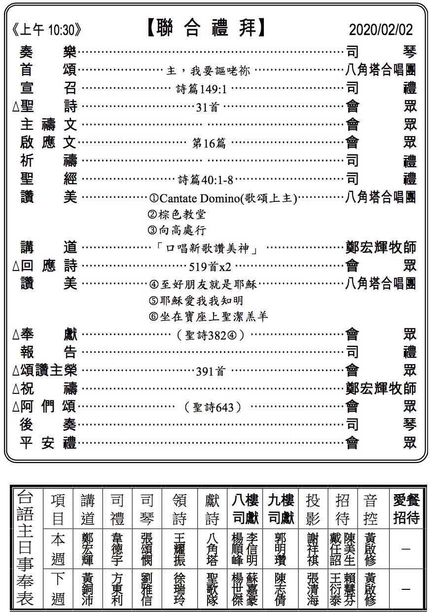 Posted on 2020 2 月 02, 證道: 鄭宏輝牧師 / 八角塔男聲合唱團團牧