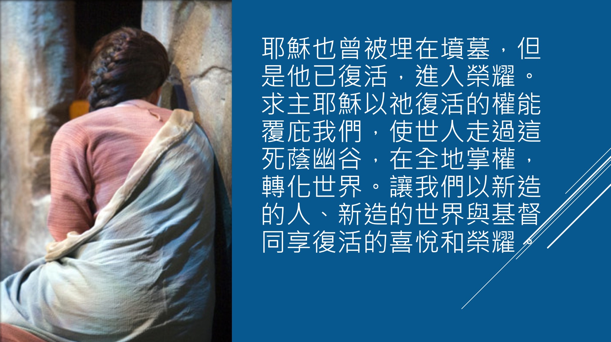 馬利亞還站在墳墓外面哭泣。她一邊哭,一邊低頭往墓裏看,