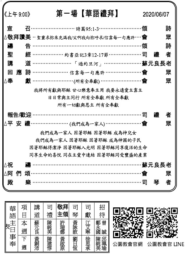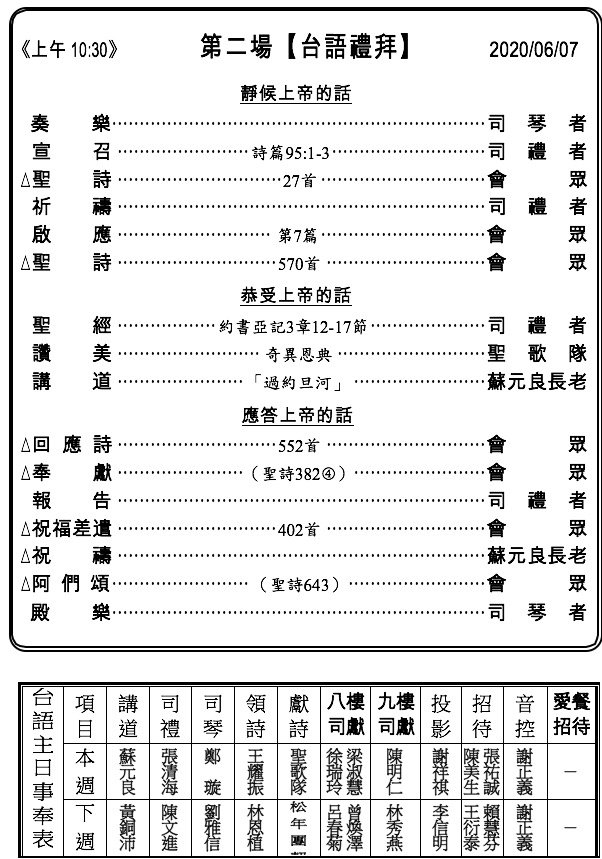 1. 本主日(6/7)感謝蘇元良長老於兩堂禮拜中講道。