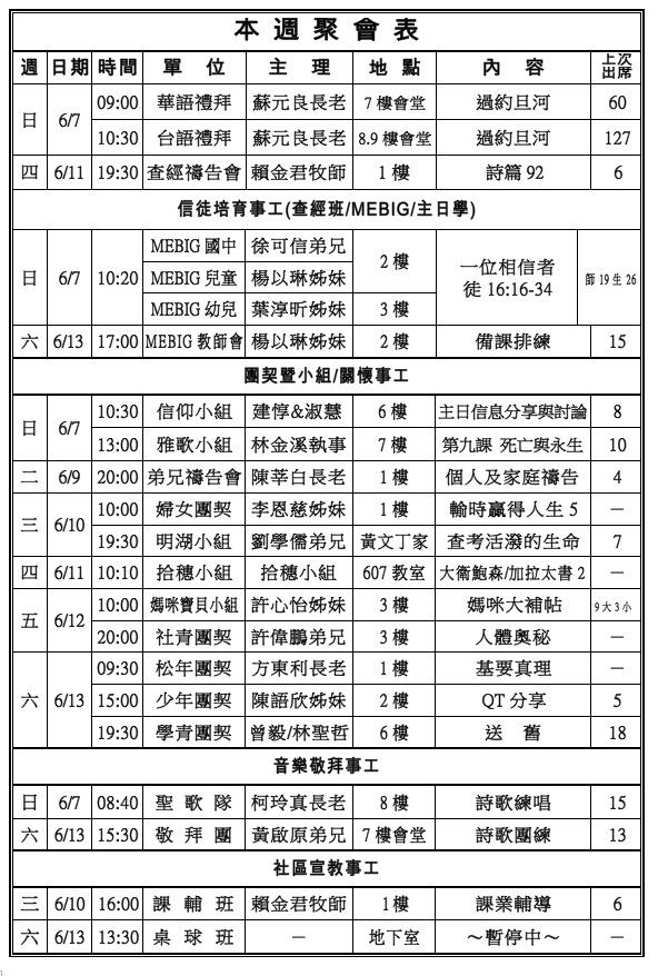 6. 本週四(6/11)晚上7:30查經禱告會,主理:賴金君牧師,查考:詩篇92。