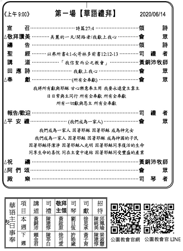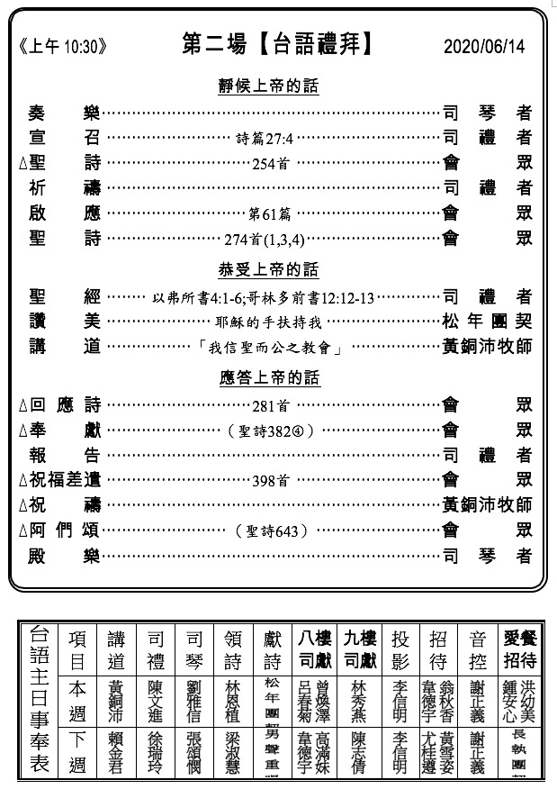 5. 近期聖禮典訂7/5(日)兩堂禮拜中舉行,欲受洗者/堅信禮者請向幹事室報名,以安排受洗課程。