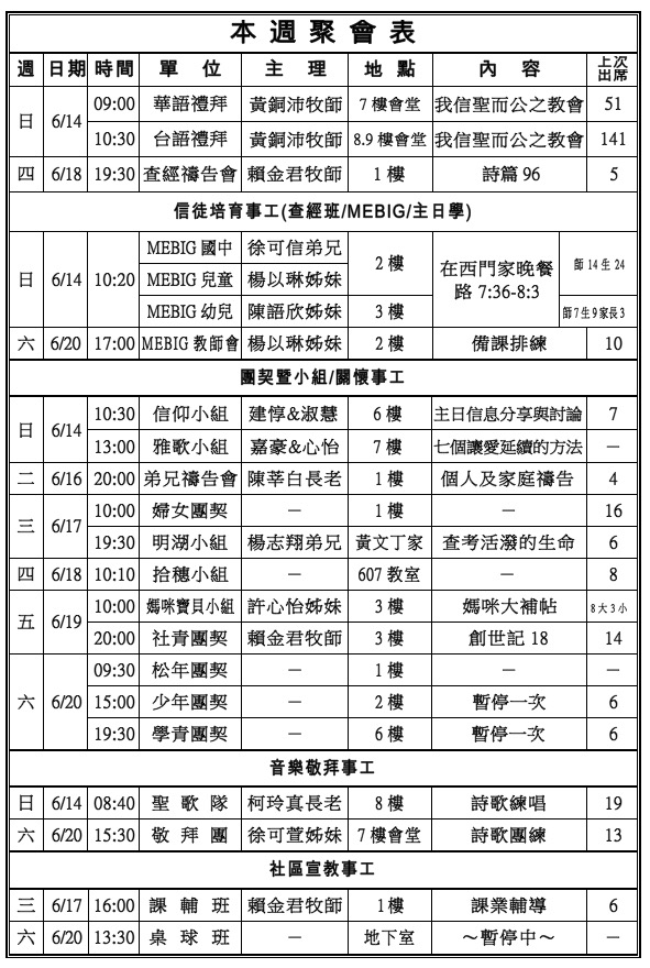 7. 本週四(6/18)晚上7:30查經禱告會,主理:賴金君牧師,查考:詩篇96。