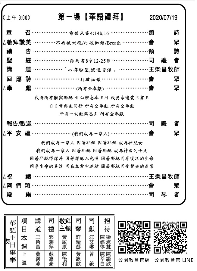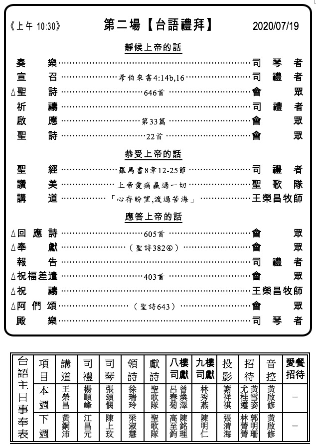 1.本主日(7/19)歡迎王榮昌牧師代表公報社為文字傳道事工來本會請安報告,並於兩堂禮拜中講道。