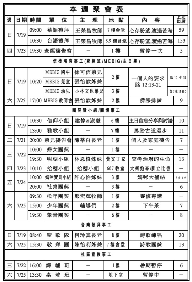 9.本週四(7/23)晚上查經禱告會暫停一次。
