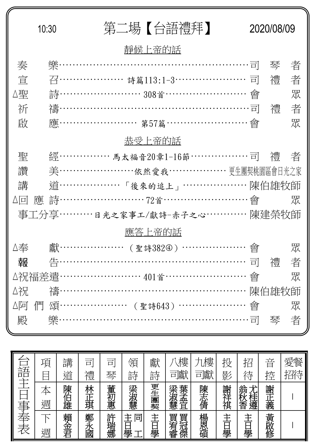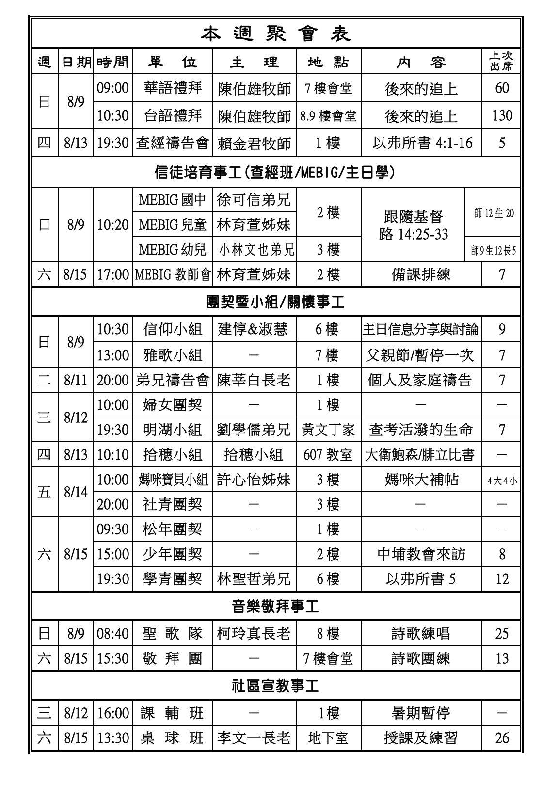 1. 本主日(8/9)邀請更生團契桃園區會團隊主領兩堂禮拜,請兄姊奉獻代禱。