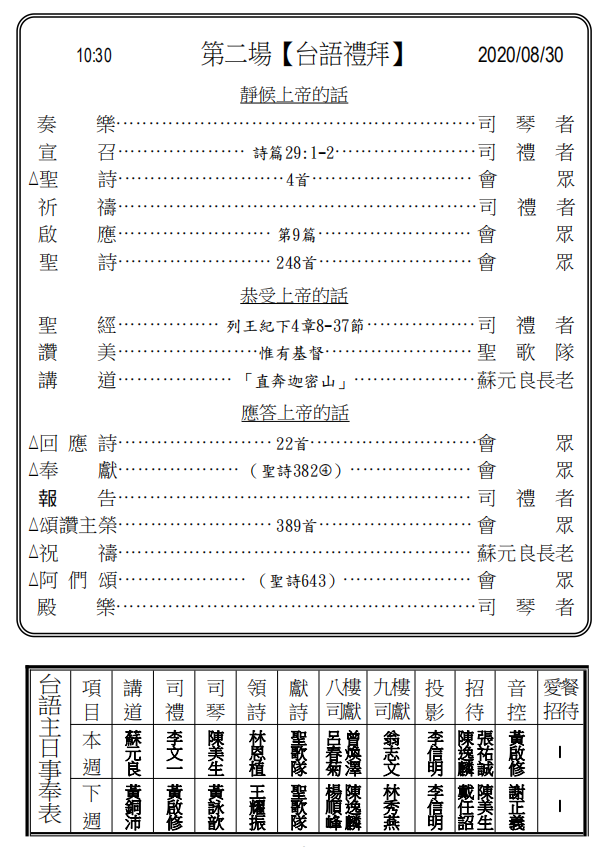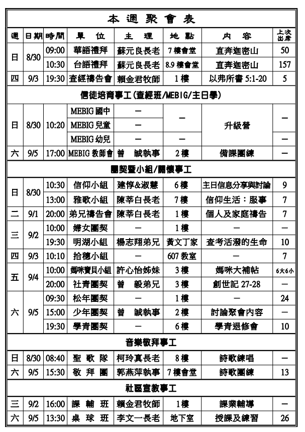 1. 本主日(8/30)感謝蘇元良長老於兩堂禮拜中講道。