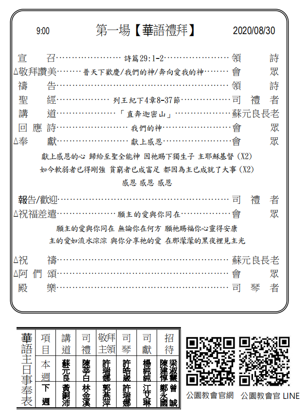 1. 本主日(8/30)感謝蘇元良長老於兩堂禮拜中講道。