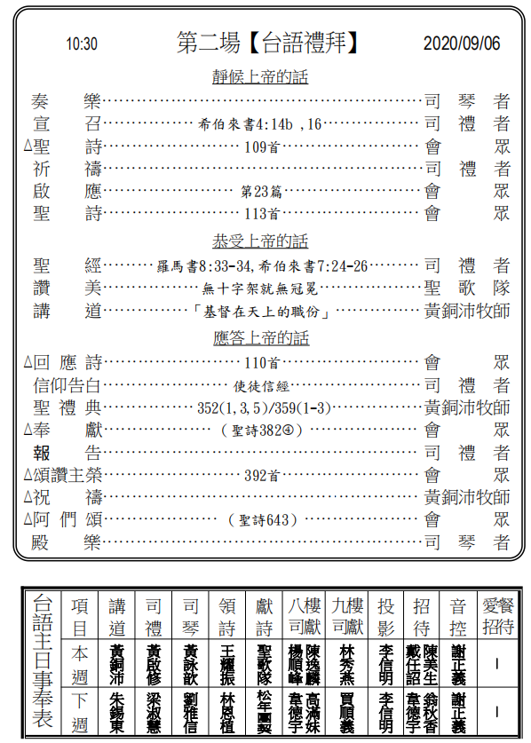 ◎下週主日兩堂禮拜預告(9月13日) ※聖經學院奉獻主日