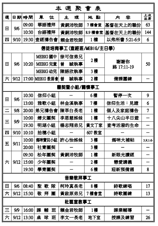 ※本週日(9/6)早上10:30的信仰分享小組暫停一次。